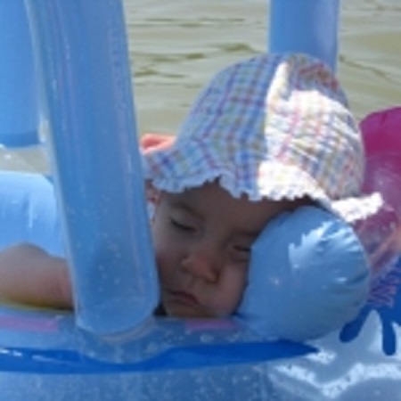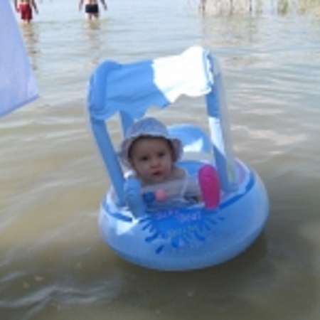 Kislányom első balatoni élménye remekül sikerült. Ekkor 8 hónapos volt és még soha nem találkozott ekkora vízzel. Eleinte lábát felhúzva tiltakozott az ismeretlen ellen, de egy kis idő elteltével már élvezte is a pancsolást. Annyira, hogy ki sem akart jönni a hűsítő habokból...de a fáradtság nagy úr! Úszógumiban ülve hirtelen lecsokódott a szeme és mély álomba szenderült. Még akkor sem ébredt fel, amikor apukája kihozta a partra és egy kellemes árnyékos helyen lefektette. A vizen elalvást azóta bemutatta az Orfűi tavon is...
